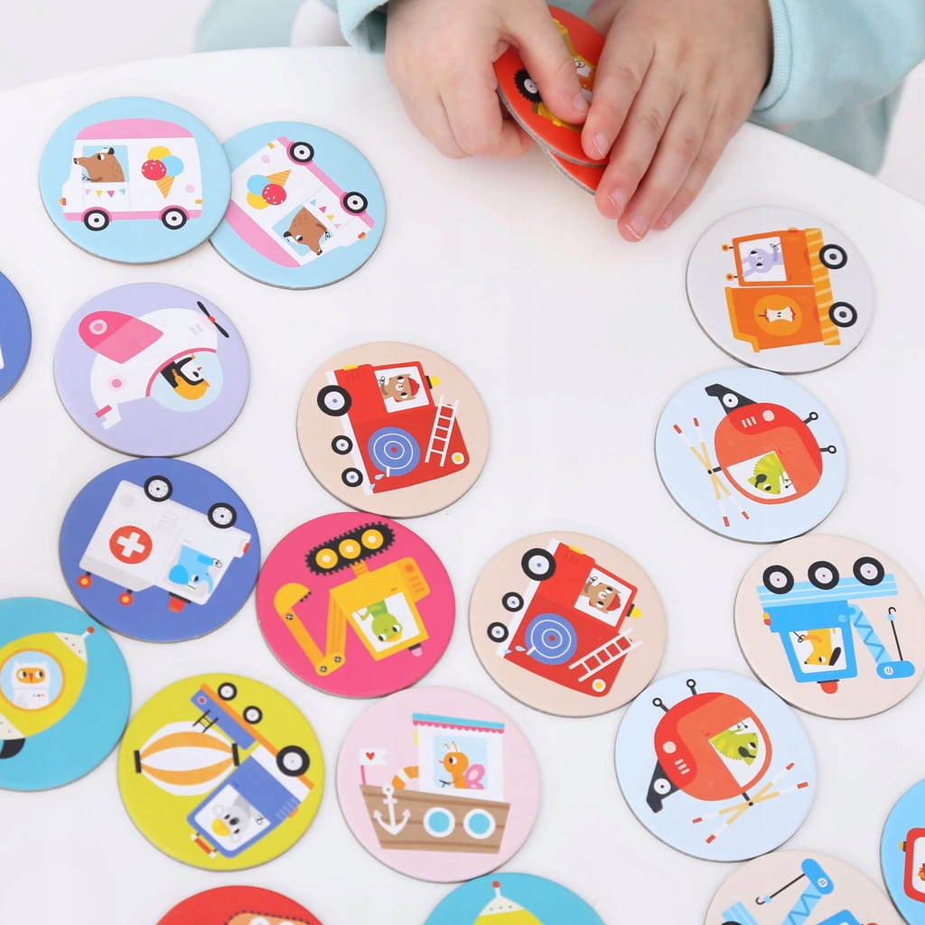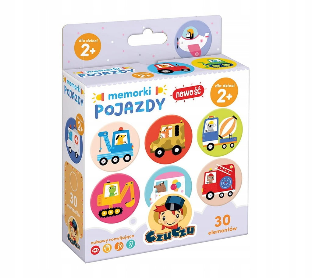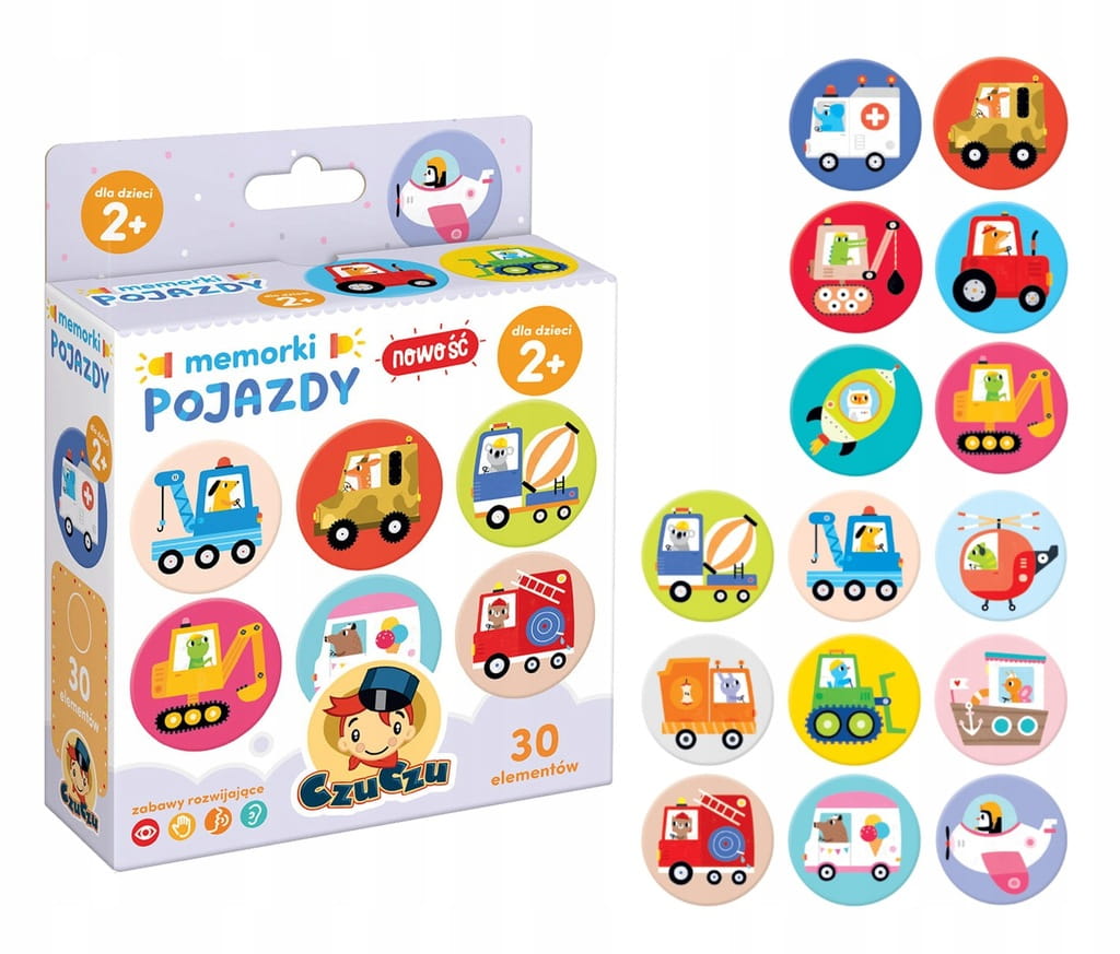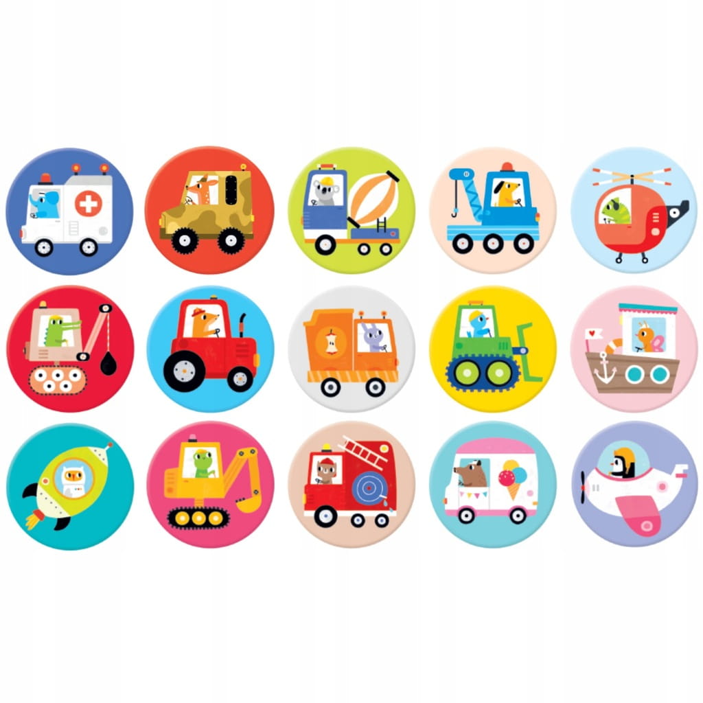 Kierowcy przeróżnych pojazdów zapraszają do wspólnej zabawy! Memorki – gra pamięciowa Pojazdy to edukacyjny zestaw zawierający 30 dużych elementów, idealny jako pierwsza prosta gra pamięciowa dla najmłodszych.