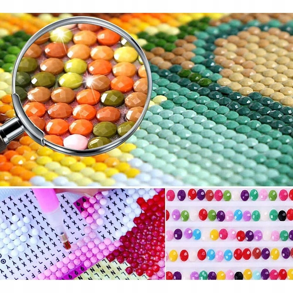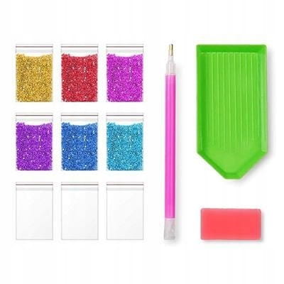 Zestaw do tworzenia mozaiki z diamencików od NORIMPEX. Składa się z płótna z grafiką pokrytego warstwą klejącą, aplikatora, diamencików, kuwety, wosku i torebki. Wzór graficzny na płótnie składa się z małych kolorowych kwadracików z literkami i cyferkami. Każdy ze znaków na kolorowym tle odpowiada danemu rodzajowi diamencika. Przy pomocy aplikatora, którego końcówka pokryta jest woskiem, możemy z łatwością pobierać kryształ i umieszczać go precyzyjnie w odpowiednim miejscu. Kuweta, która posiada specjalne wyżłobienia, ułatwia pobieranie pojedynczego kryształka.