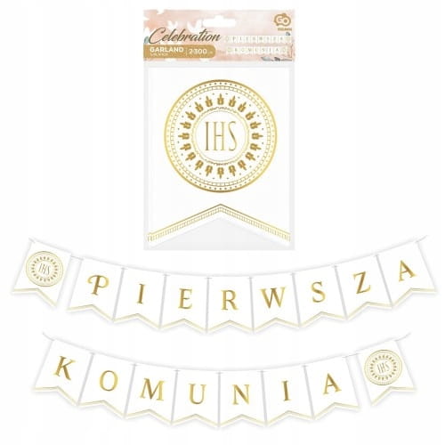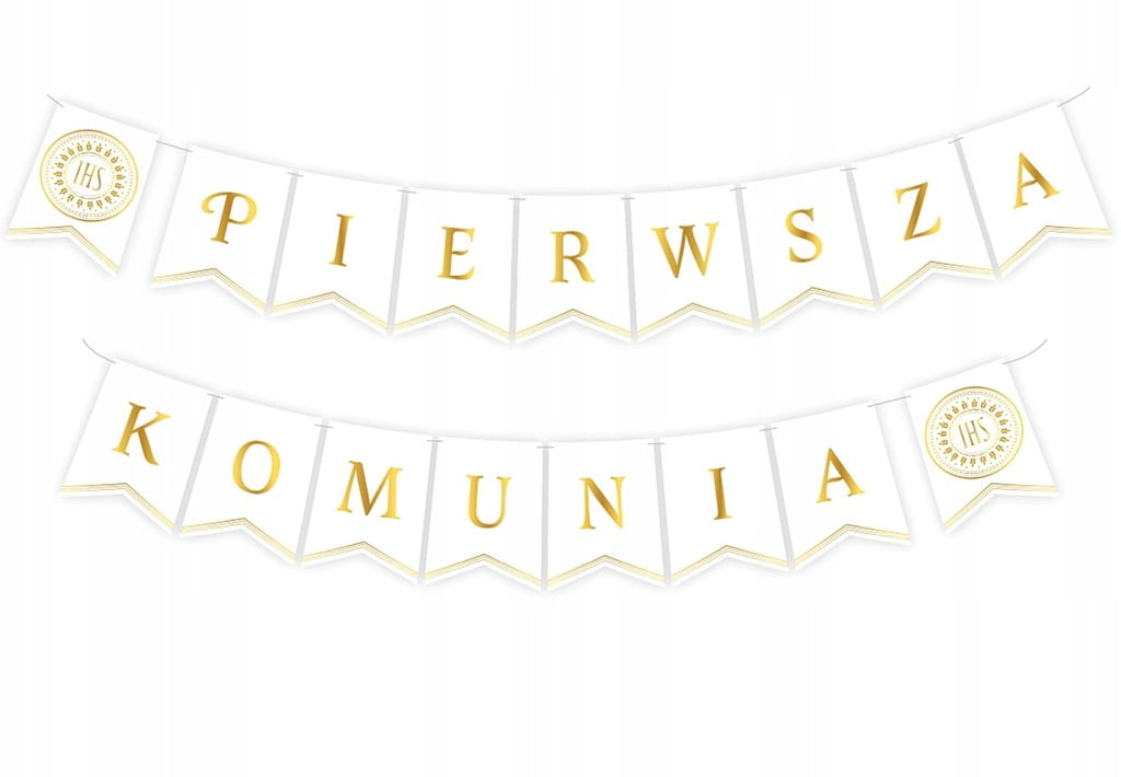 Girlanda papierowa Pierwsza Komunia, białe flagi ze złotymi błyszczącymi literami.