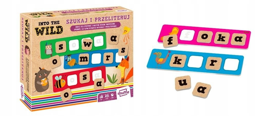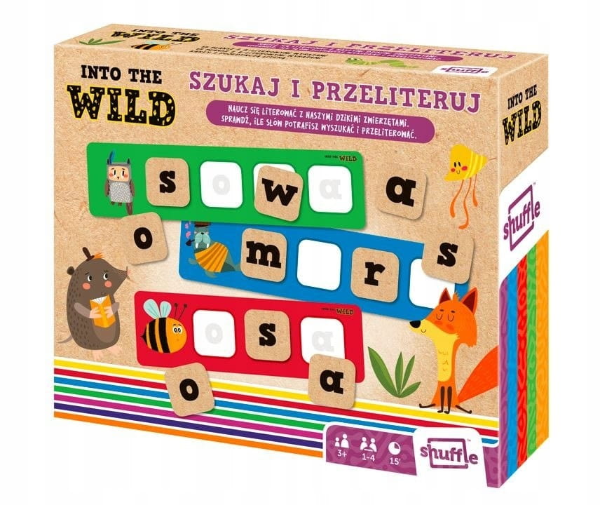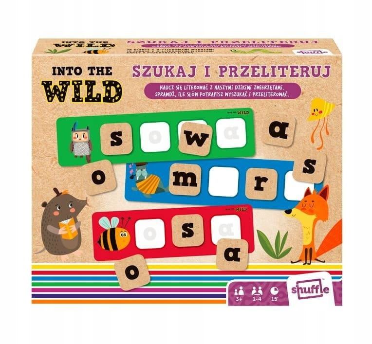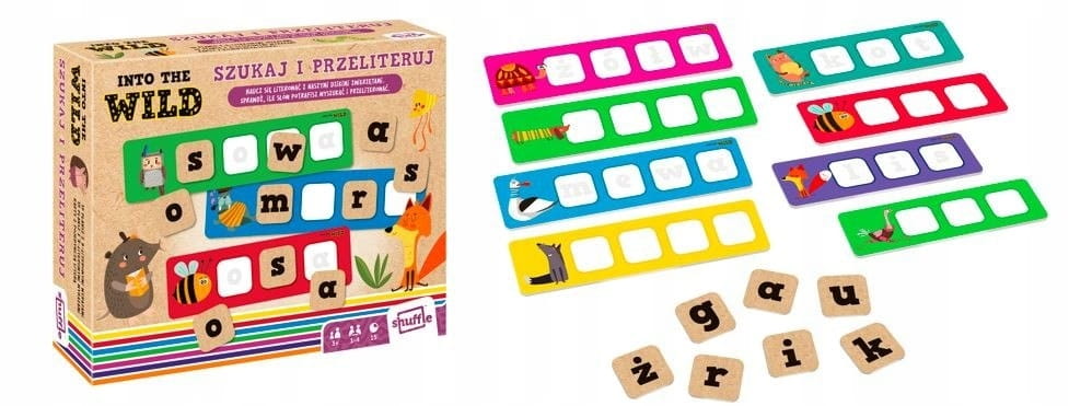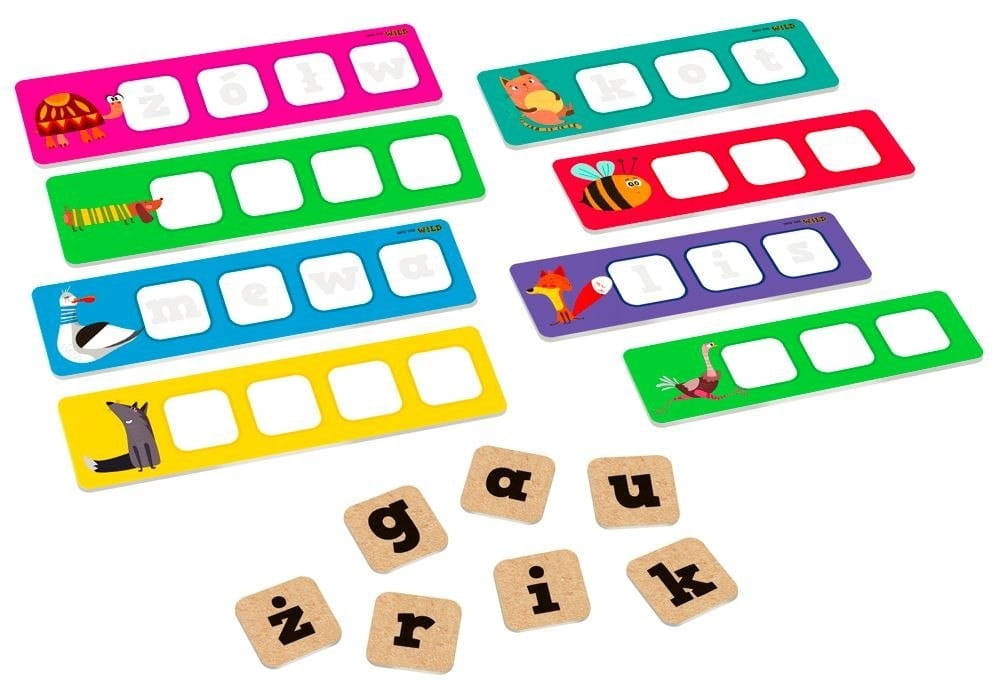 Ekscytująca gra w poszukiwanie i literowanie z dzikimi zwierzętami. Ćwicz z dzieckiem alfabet, literowanie i składanie wyrazów. Dwa stopnie trudności z 3- i 4-literowymi wyrazami.