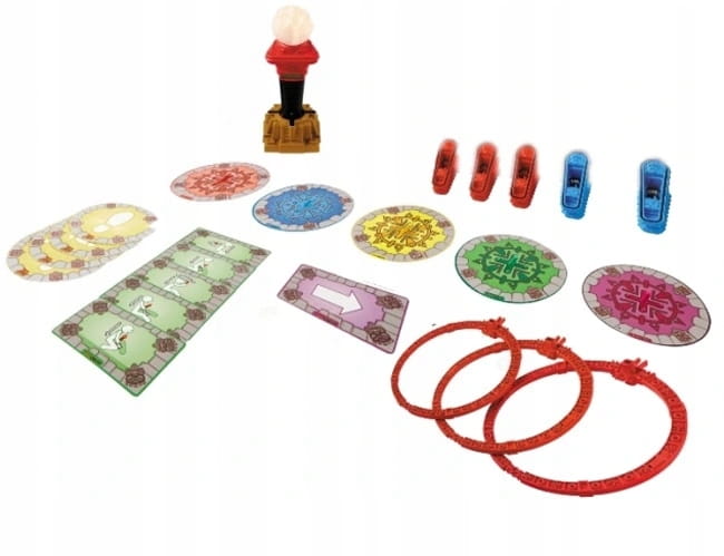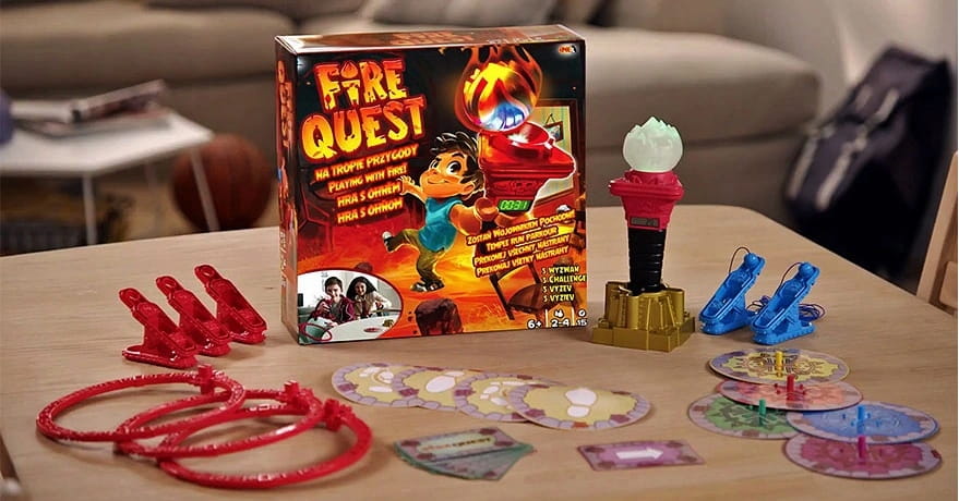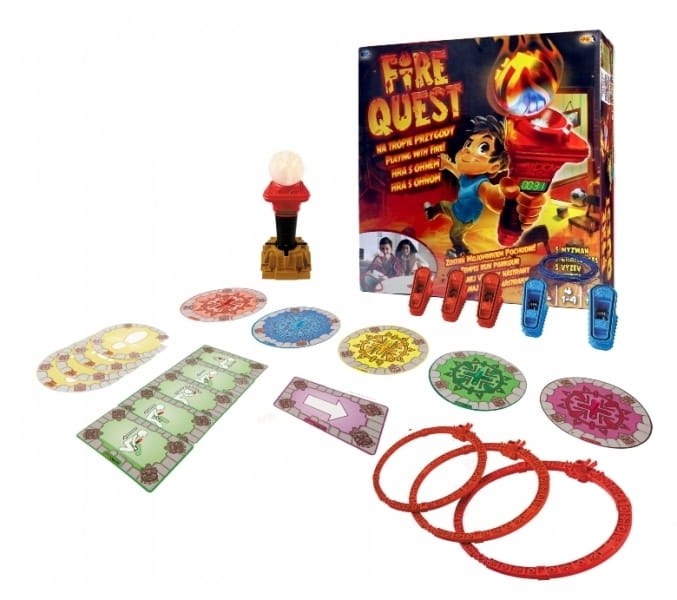 Gra Fire Quest - Na tropie przygody polega na wykonaniu wszystkich zadań bez upuszczenia ognia z pochodni, a płomień wskaże Ci kolejność wykonywania zadań! Zwycięża gracz, który wykona poprawnie wszystkie zadania najszybciej, bez upuszczenia płomienia, a jeśli spadnie, zaczynasz od początku. Gra zachęca do aktywnej zabawy! Zadania w Fire Quest oznaczone są pięcioma kolorami: niebieski - spacer po linie; żółty - bieg przez lawę; czerwony - tajemnicze przejście; zielony - misja specjalna; różowy - tor przeszkód. Zawartość pudełka: pochodnia z licznikiem czasu i czujnikem ruchu; płomień pochodni; karty wyzwań; elementy niezbędne do wykonania poszczególnych misji (obręcze, linka, klipsy); stacja dokująca pochodnię; 5 punktów kontrolnych; instrukcja.