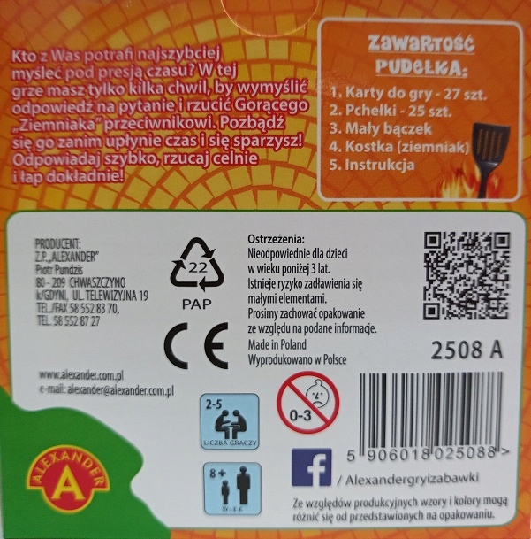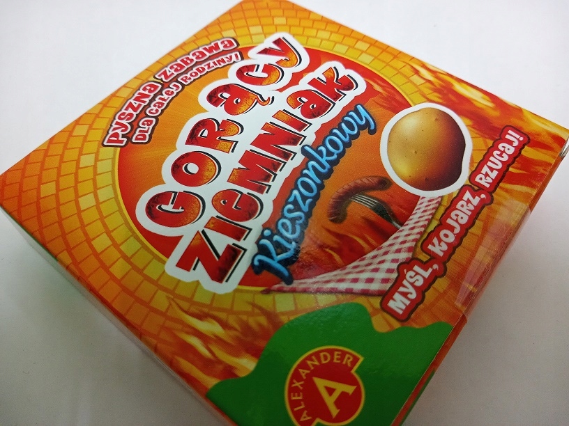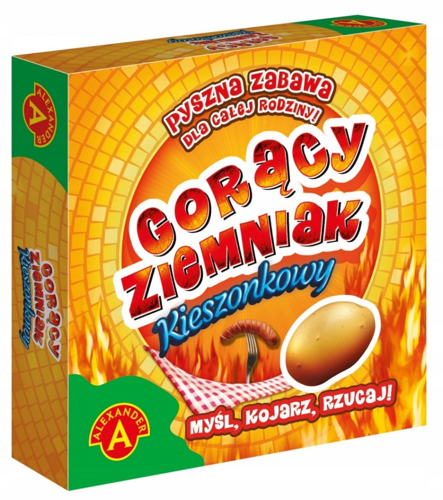 Wielki hit sprzedażowy, który teraz zmieści się nawet do Twojej kieszeni! To przezabawna gra rodzinna sprawdzająca refleks. Zakręć bączkiem lub ustaw czas w aplikacji, odkryj pytanie i odpowiadaj czym prędzej! Każda osoba, która udzieli poprawnej odpowiedzi, przerzuca gorącego ziemniaka do najbliższego sąsiada. Ten, kto nie zdąży odpowiedzieć, zanim czas się skończy, zostaje ze spalonym ziemniakiem i na planszy spada coraz bliżej grilla. W tej zabawie wygrywa gracz, który wykonał najmniej ruchów własnym pionkiem. Prosta, ale niezwykle wciągająca rozgrywka przypadnie do gustu każdemu, niezależnie od wieku.