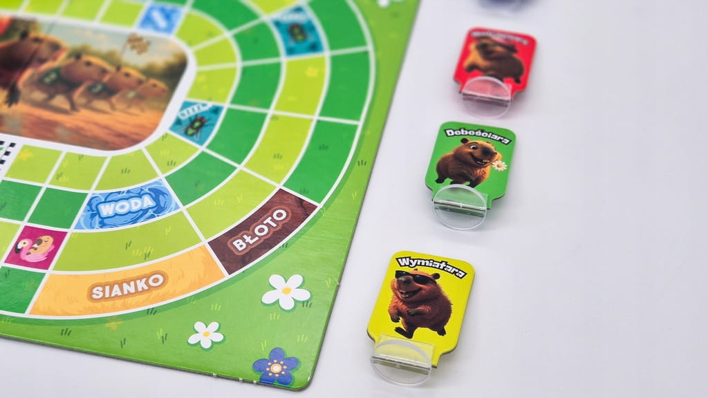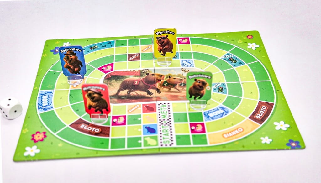 Rozgrywka jest prosta: rzucasz kostką i przesuwasz swoją kapibarę po torze. Ale uwaga – na trasie czekają różne niespodzianki! Błotniste pola mogą Cię spowolnić, sianko doda Ci energii, a woda przyspieszy Twój ruch. Może trafi się też relaks albo… natrętna mucha, która popsuje Twoje plany!