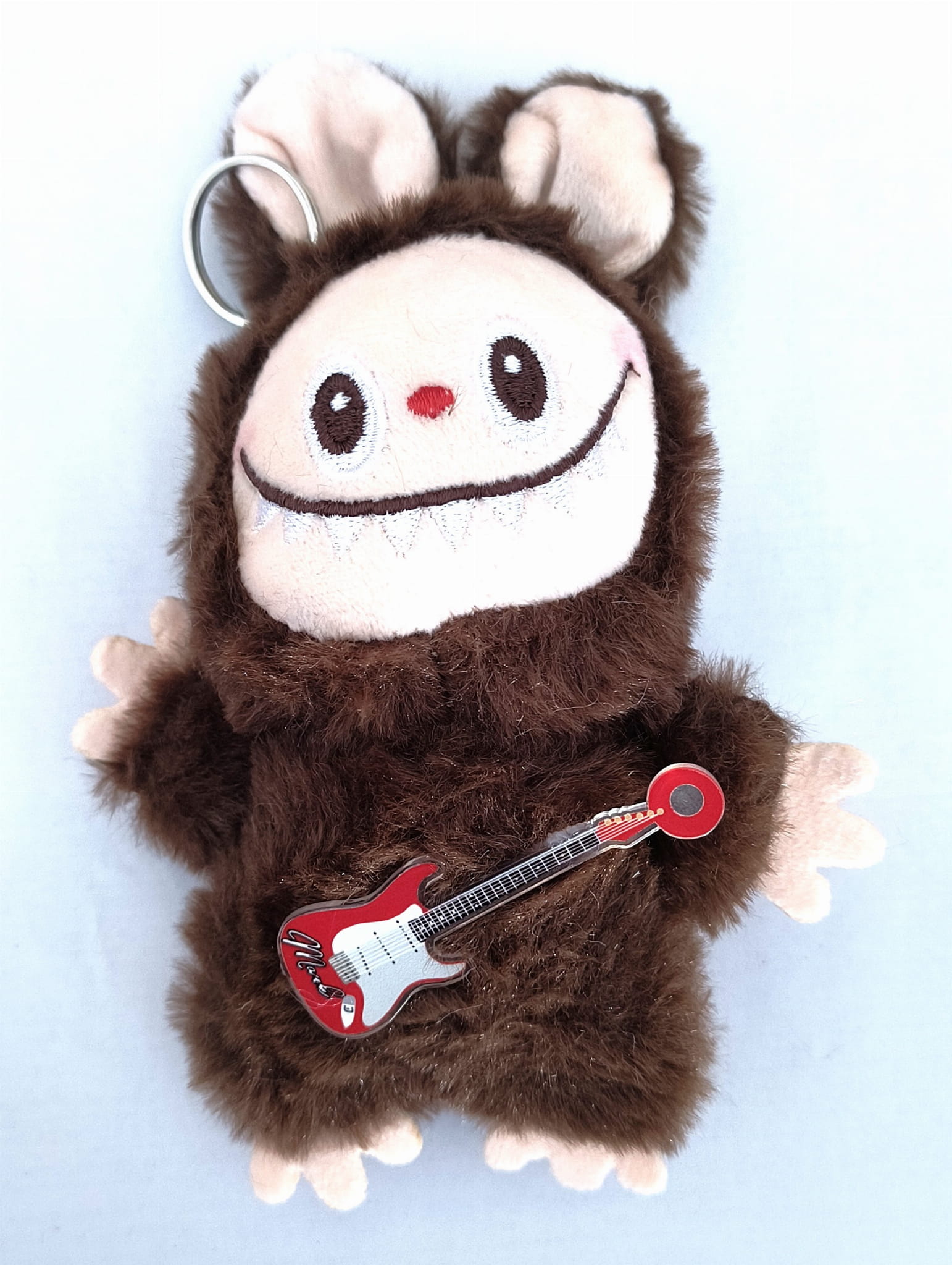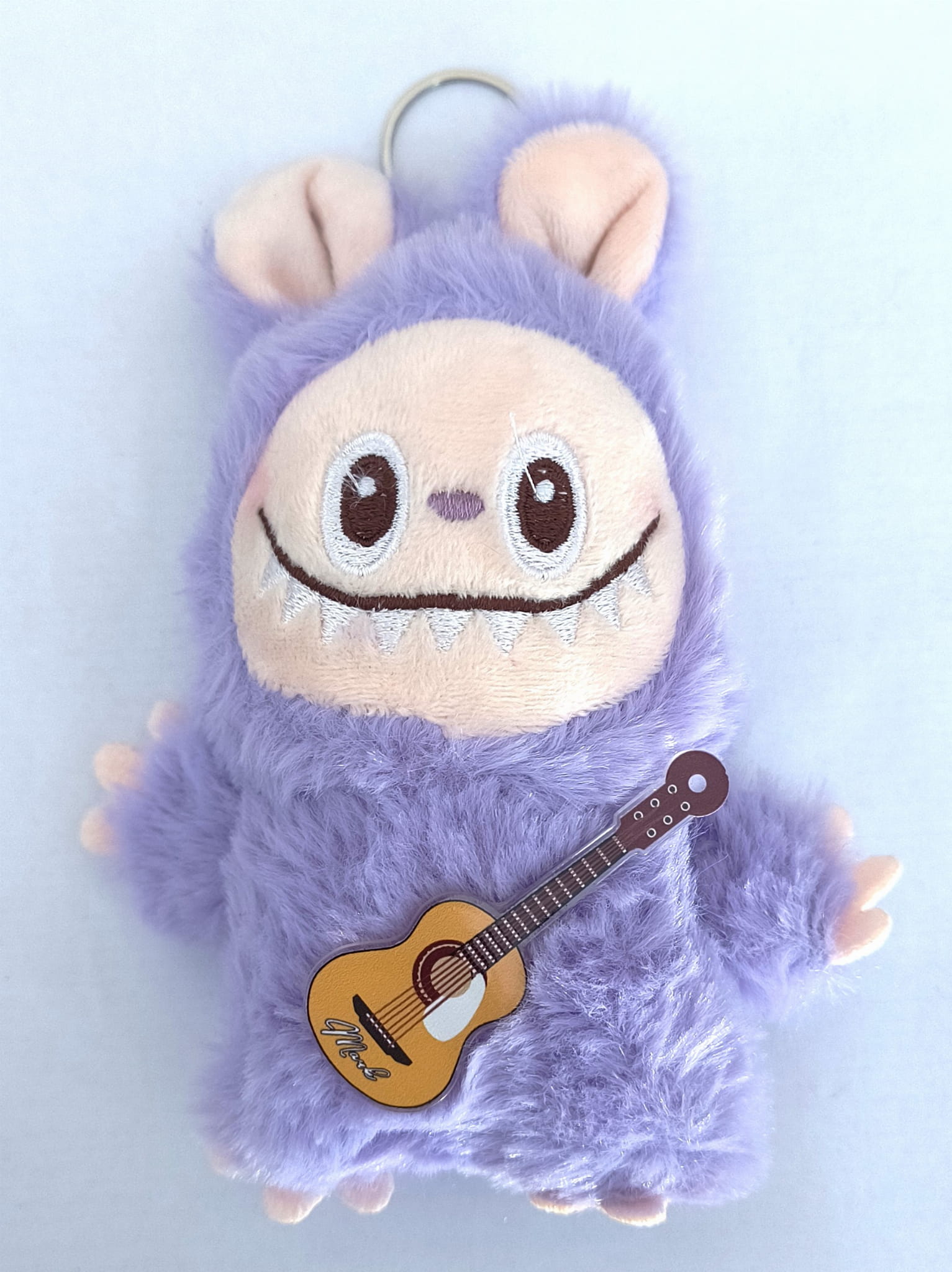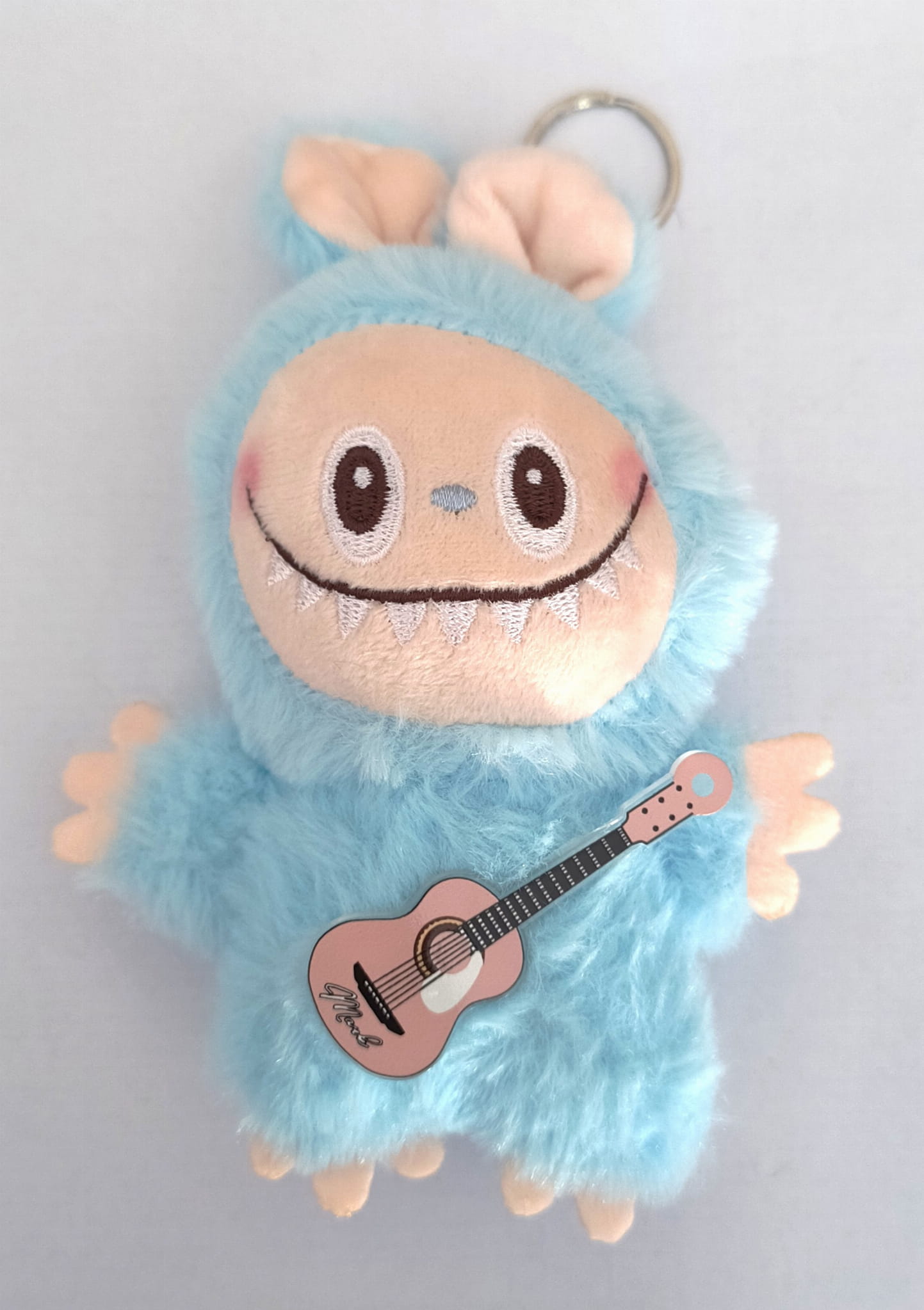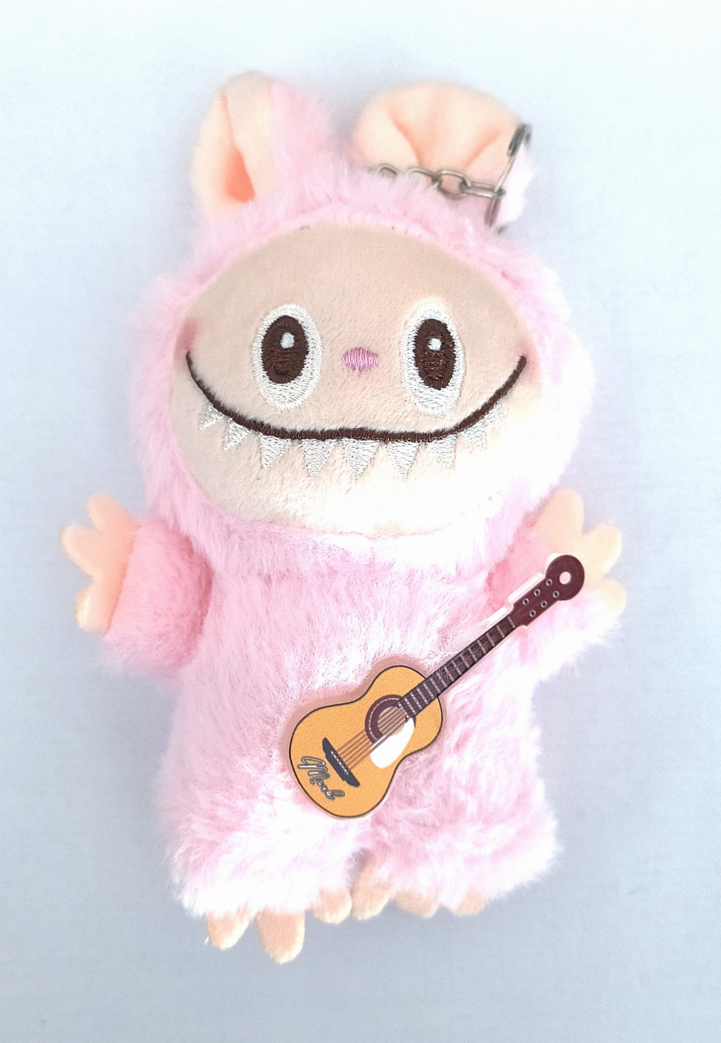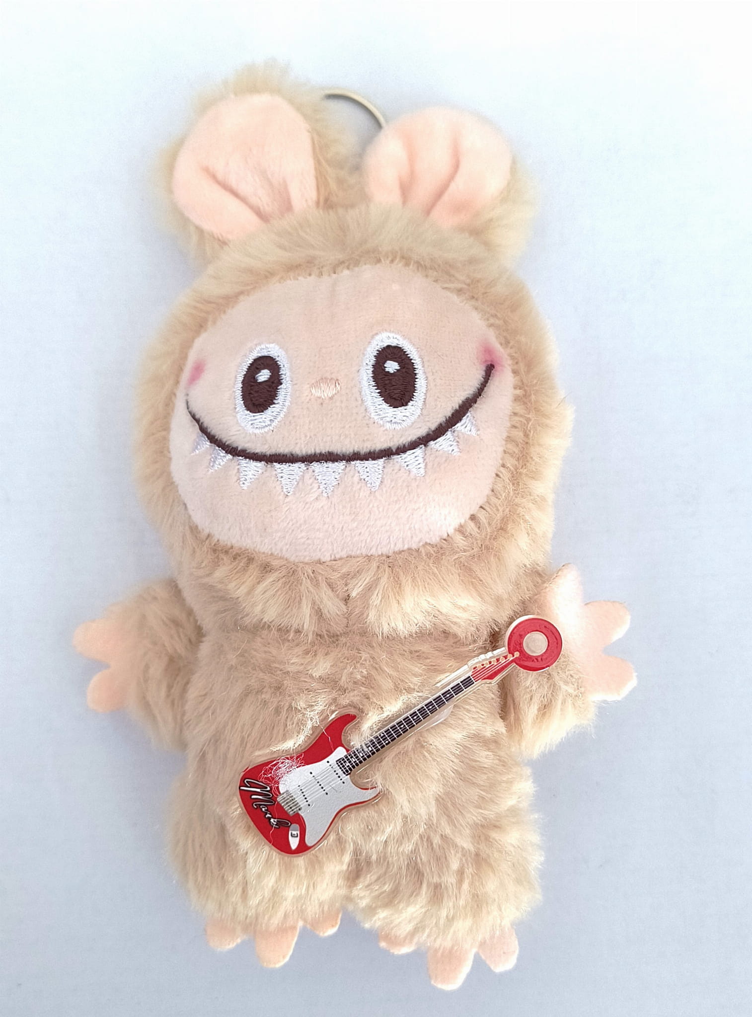 Miękki brelok pluszowy w kształcie kolorowej postaci z uroczymi uszkami i gitarą, wykonany z przyjemnego w dotyku materiału, idealny do przypięcia do kluczy, plecaka lub torby, dostępny w różnych wersjach kolorystycznych, lekki, trwały i świetny jako prezent dla dzieci i młodzieży.