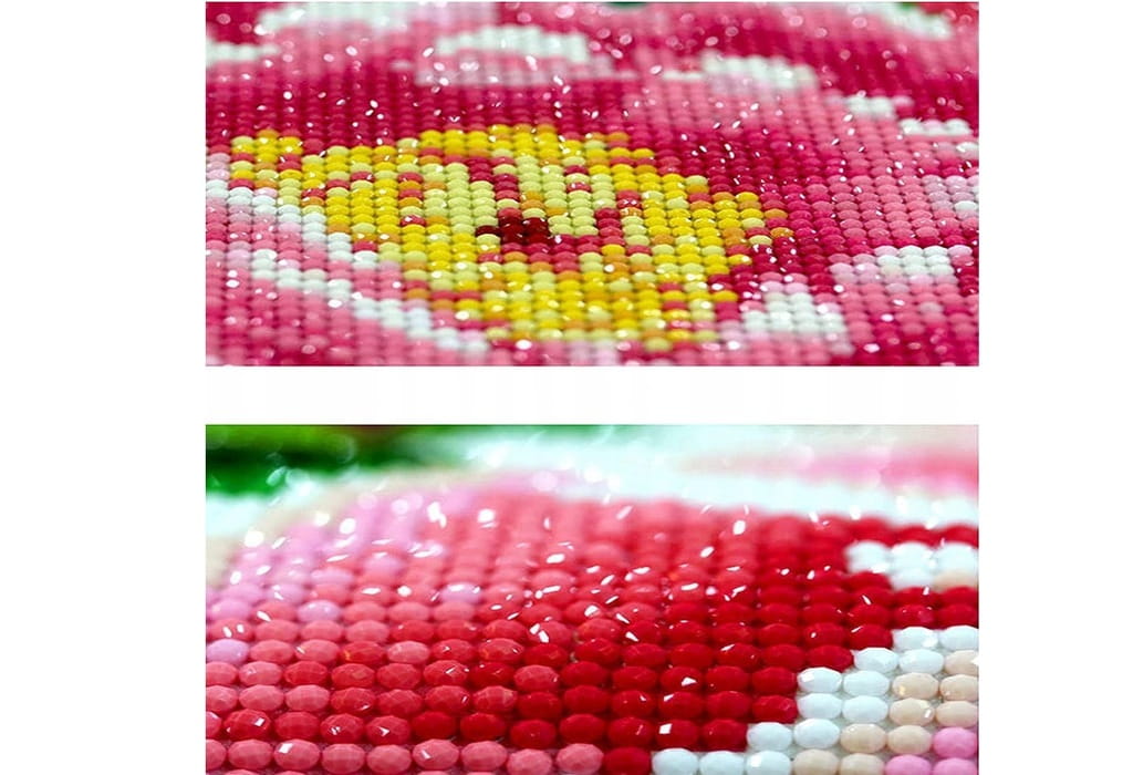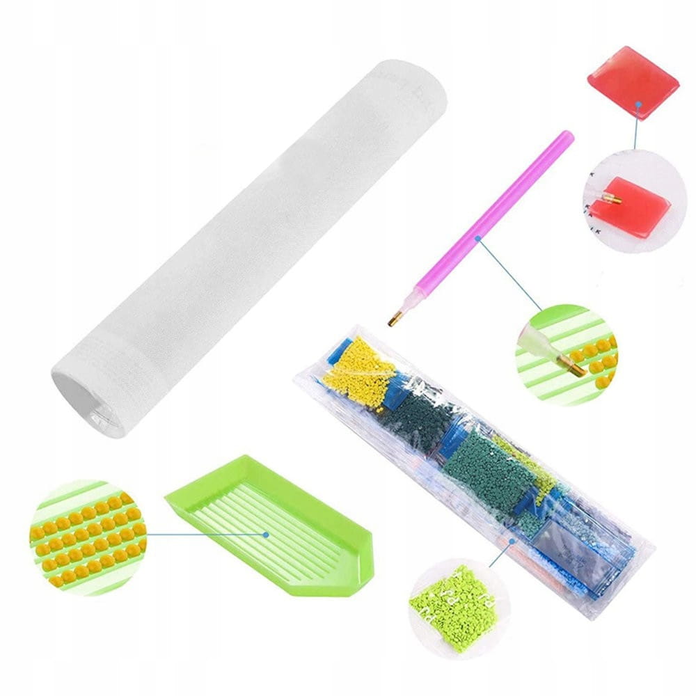 Na płótnie o wymiarach 30×40 cm znajduje się nadrukowany wzór z małych kwadracików oznaczonych literami i cyframi. Każdy znak odpowiada konkretnemu diamencikowi. Za pomocą aplikatora pokrytego woskiem można precyzyjnie pobierać kryształki i umieszczać je w odpowiednich miejscach. Kuweta z wyżłobieniami ułatwia pobieranie pojedynczych diamencików. Po ułożeniu wszystkich elementów powstaje kompletny obraz, który można powiesić na ścianie.