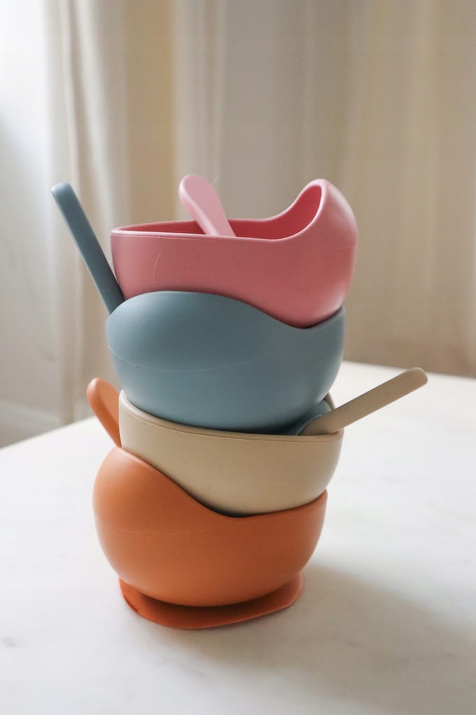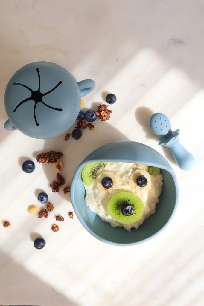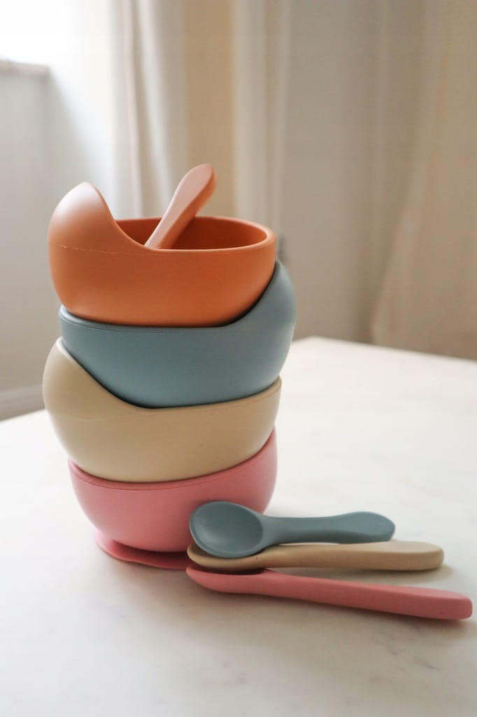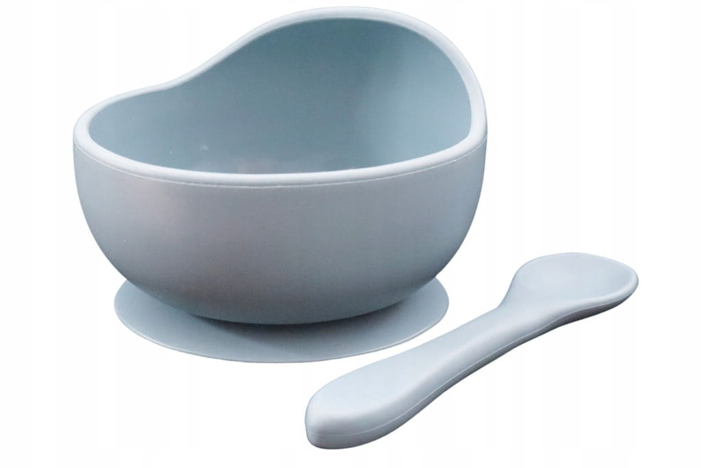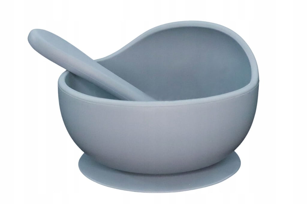 Silikonowa miseczka z łyżeczką pomaga rozwijać umiejętności motoryczne u dzieci.