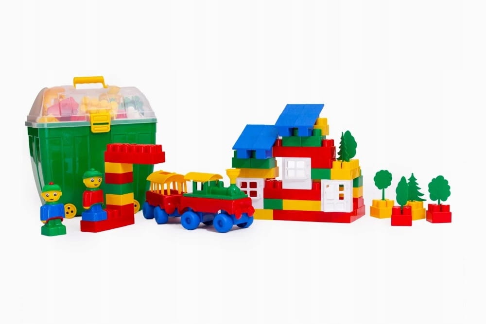 - Mnóstwo różnorodnych elementów - mieści ok. 60 różnych elementów, w tym okienka, drzwi, drzewka, ludziki, pociągi, samochodziki