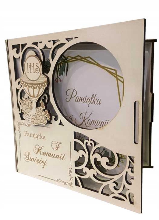 Pamiątka Komunii świętej DREWNIANE PUDEŁKO + Kartka