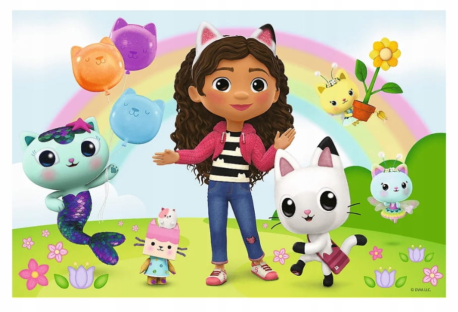 Weseli Przyjaciele Gabi to puzzle składające się z 60 bardzo dużych elementów, wśród których znajdują się również puzzle o nietypowych kształtach. Puzzle zostały stworzone z myślą o wszystkich fanach i fankach bajki Koci Domek Gabi.