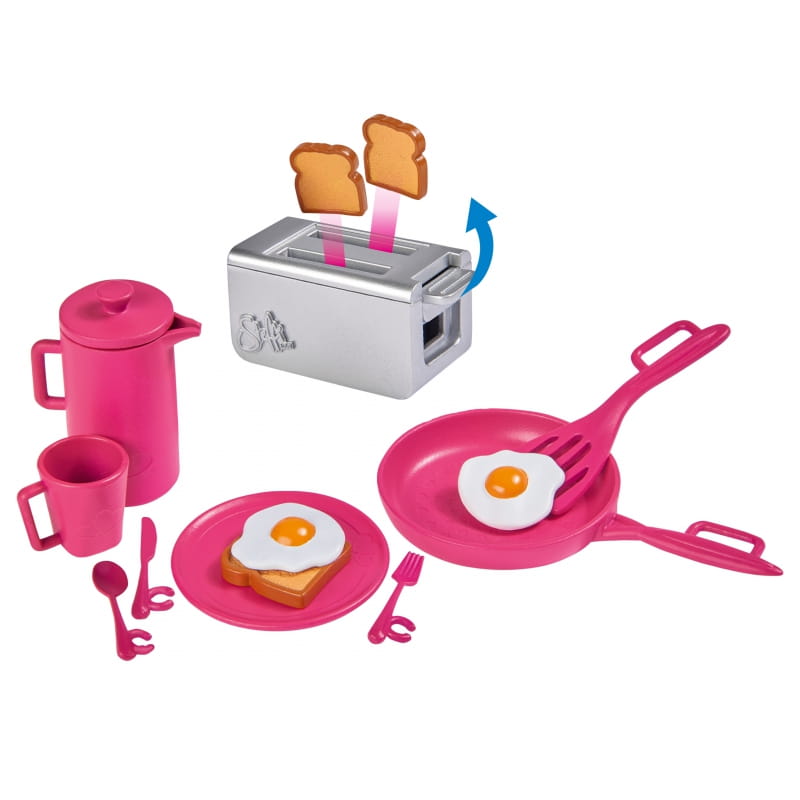 - - zestaw zawiera 14 akcesoriów do przygotowywania i jedzenia porannego posiłku, między innymi toster z funkcją Try-me