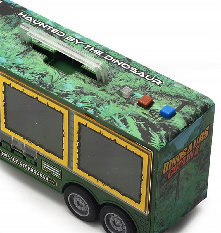 Duży rozmiar, długość to około 33 cm. W cięzarówce zanjduje się naczepa, w której są 3 małe samochodziki dinozaury, są to samochodziki wyczynowe z napędęm pull-back.