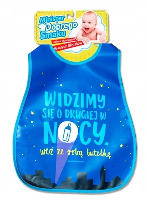 Wesoły i zabawny śliniak, który rozbawi do łez rodziców i otoczenie. Taki kolorowy ślinika stanowi cudowny pomysł na prezent i czasoumilacz w tych ciężkich dla rodziców najmłodszych latach. Śliniak wykonany jest z nieprzemakalnej folii PEVA, zapinany na rzep, wyposażony w specjalną kieszonkę wyłapującą resztki jedzenia. Wymiary (w najszerszym i najdłuższym miejscu) to 28 cm x 44 cm.