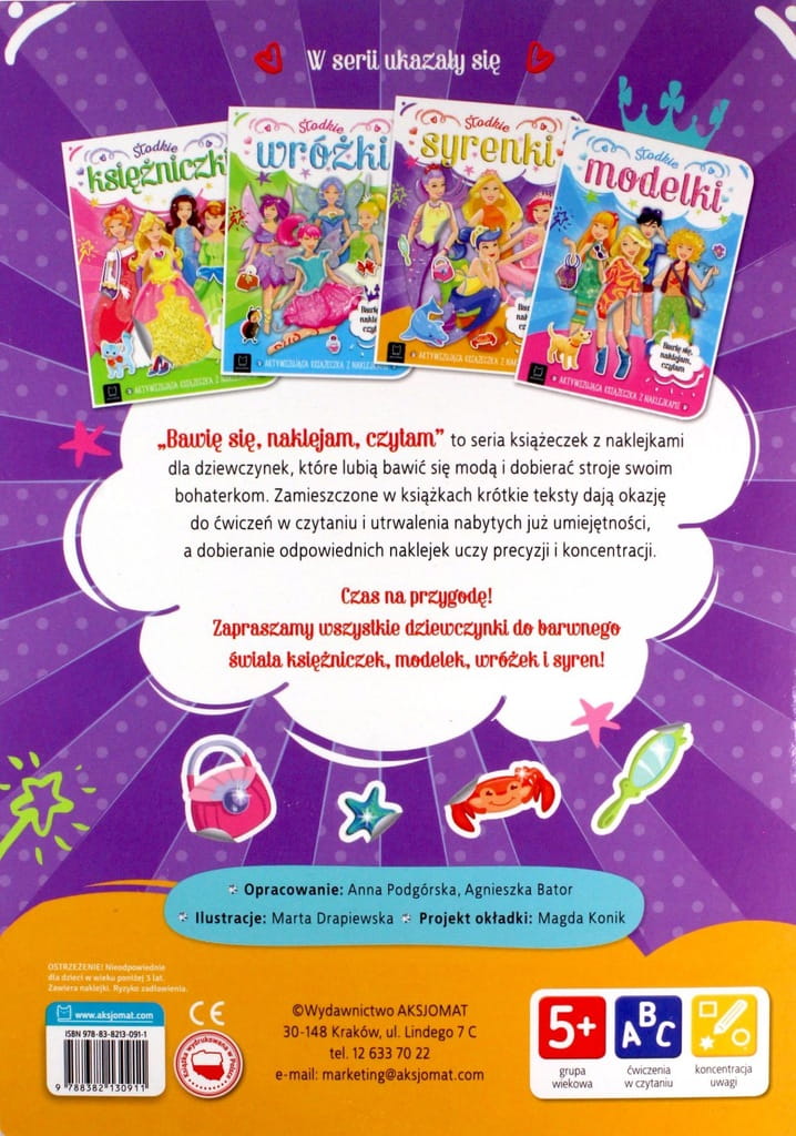 "Bawię się, naklejam, czytam" to seria książeczek z naklejkami dla dziewczynek, które lubią bawić się modą i dobierać stroje swoim bohaterkom. Zamieszczone w książkach krótkie teksty dają okazję do ćwiczeń w czytaniu i utrwaleniu nabytych już umiejętności, a dobieranie odpowiednich naklejek uczy precyzji i koncentracji.
