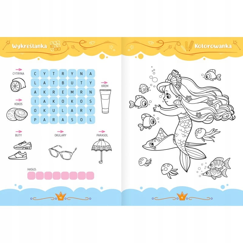 "Słodkie syrenki. Aktywizująca książeczka dla dziewczynek" to zbiór zajmujących łamigłówek oraz kolorowanek do ciekawego spędzania czasu i rozwijania wielu przydatnych umiejętności. W książce dzieci znajdą sześć typów zadań: