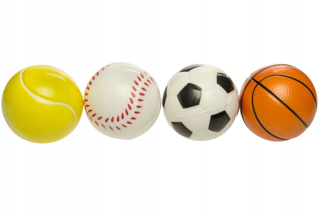 Piłeczki do ściskania, rzucania, odbijania w czterech sportowych wzorach. Kolorowe, z miękkiej gumy. uwielbiane przez wszystkie dzieci.