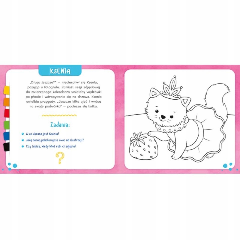 Pięknie zilustrowana malowanka z rysunkami kotków z dołączoną kredką segmentową to wyjątkowa niespodzianka i owocnie spędzony czas dla każdego dziecka. Kolorowanie uspokaja, wycisza, rozwija wyobraźnię i zdolności manualne. Baw się i koloruj kotki razem z nami!