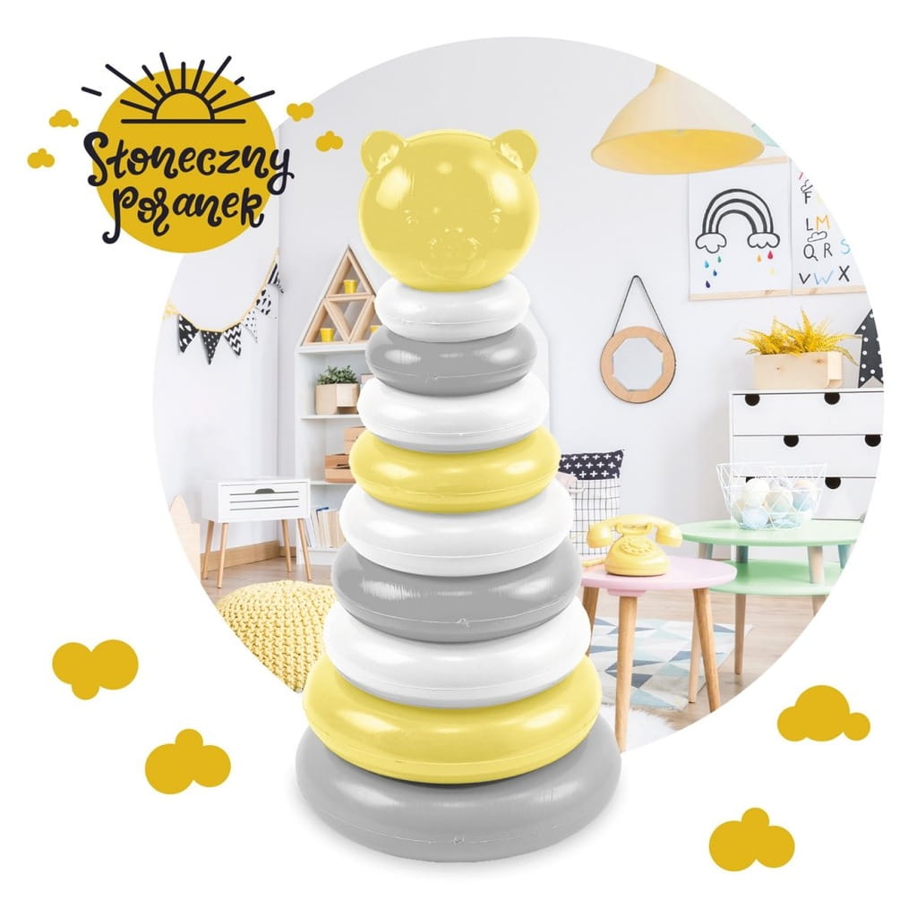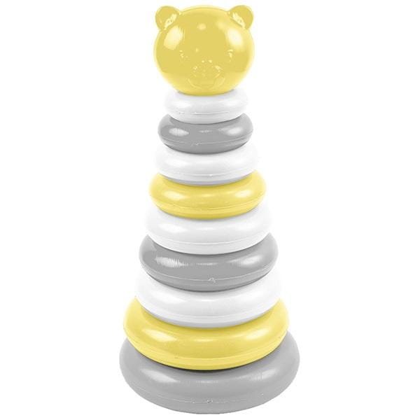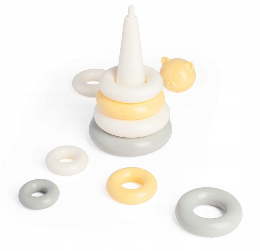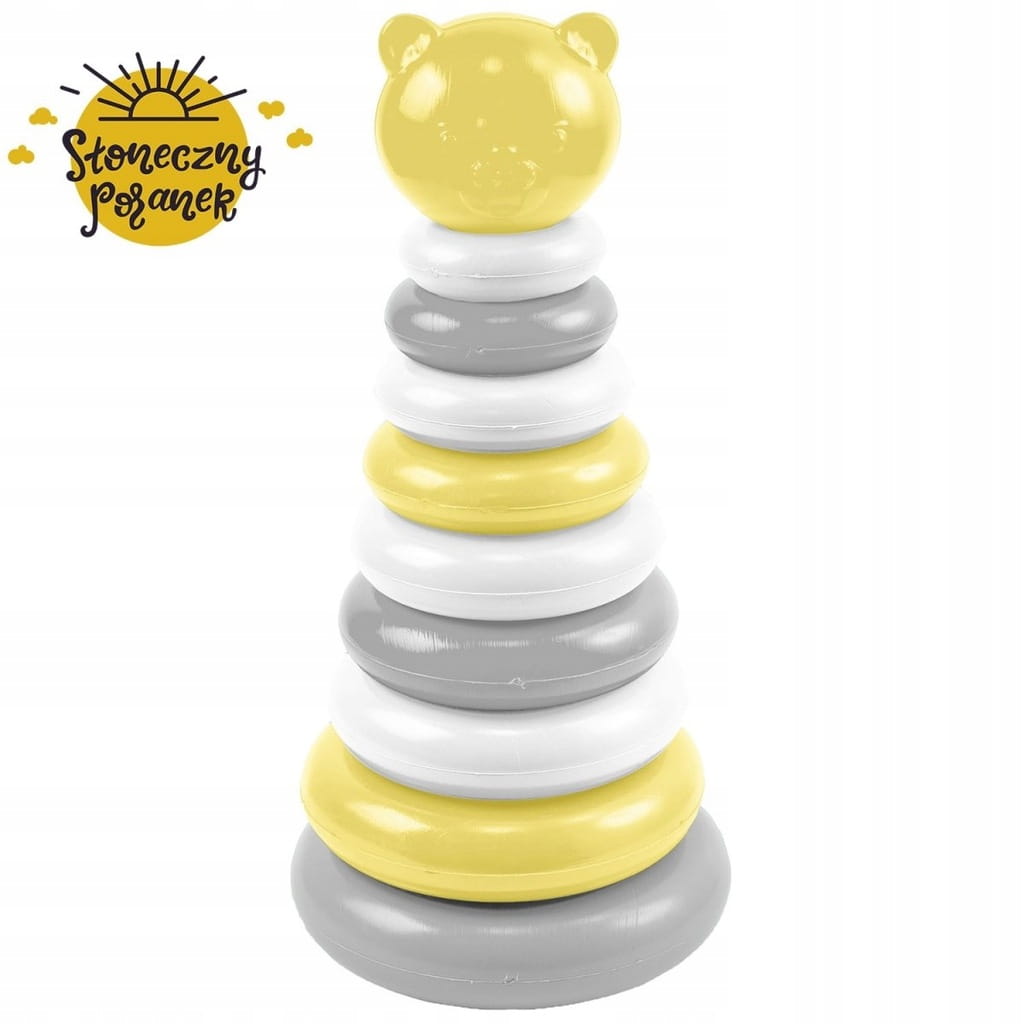 Misiowa Piramidka w kolorze żółto-biało-szarym to atrakcyjna i edukacyjna zabawka dla najmłodszych dzieci. Zestaw składa się z podstawy ze słupkiem oraz różnej wielkości kółek, które dziecko układa od największego do najmniejszego. Całość wieńczy urocza główka misia, tworząc kompletną piramidkę, która przyciąga uwagę i zachęca do zabawy.