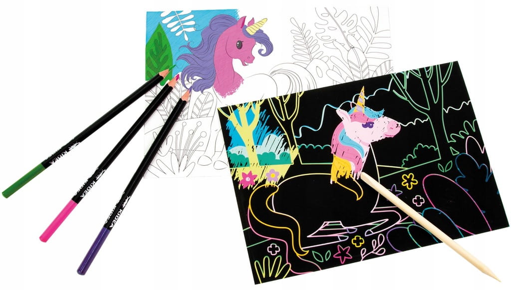 Wystarczy zdrapać czarną warstwę przy pomocy rysika, aby ujawnić kolorowy obrazek.