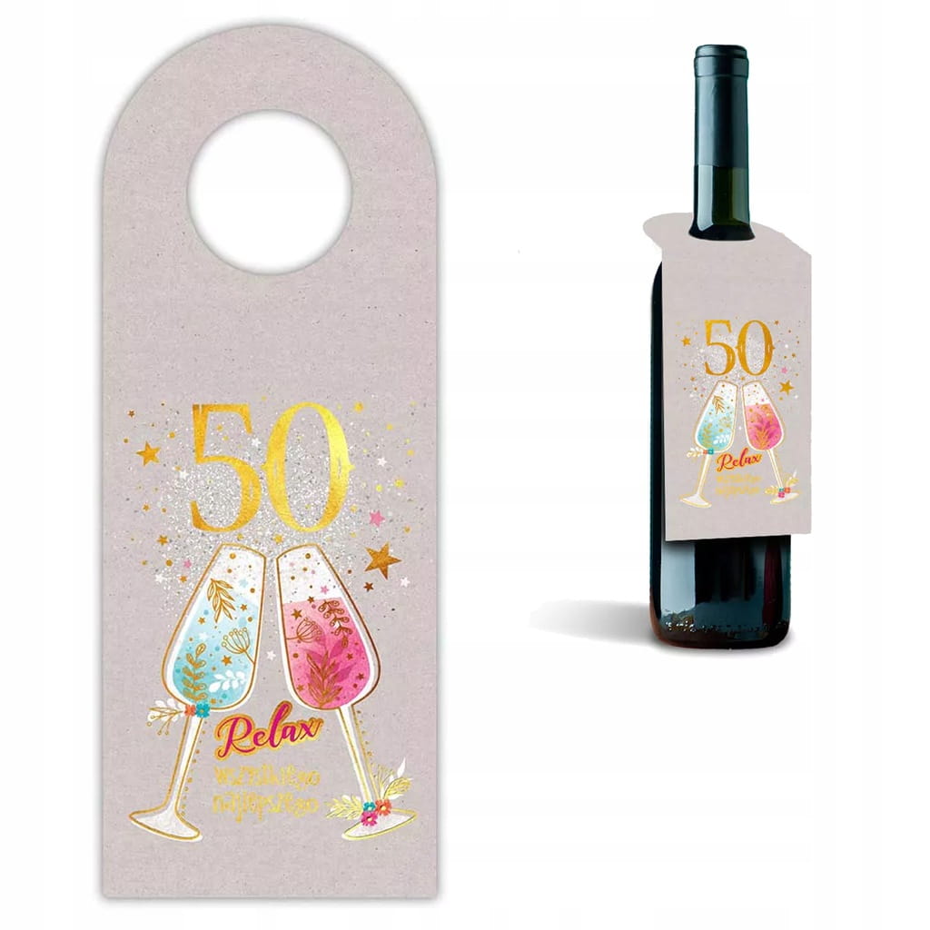 Zawieszka na butelkę 50 Zawieszka na butelkę, na różne okazje śmieszne i poważne. Zdobiona złotem, ekskluzywna dekoracja butelki.