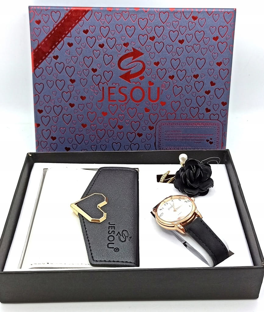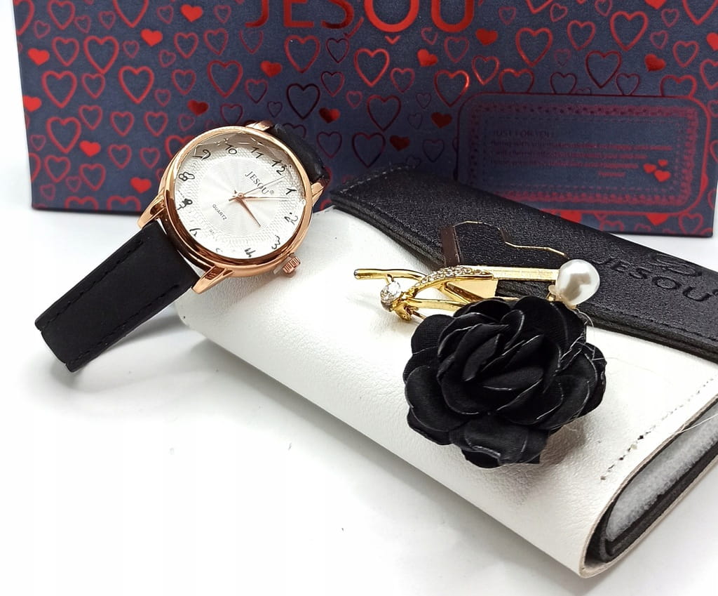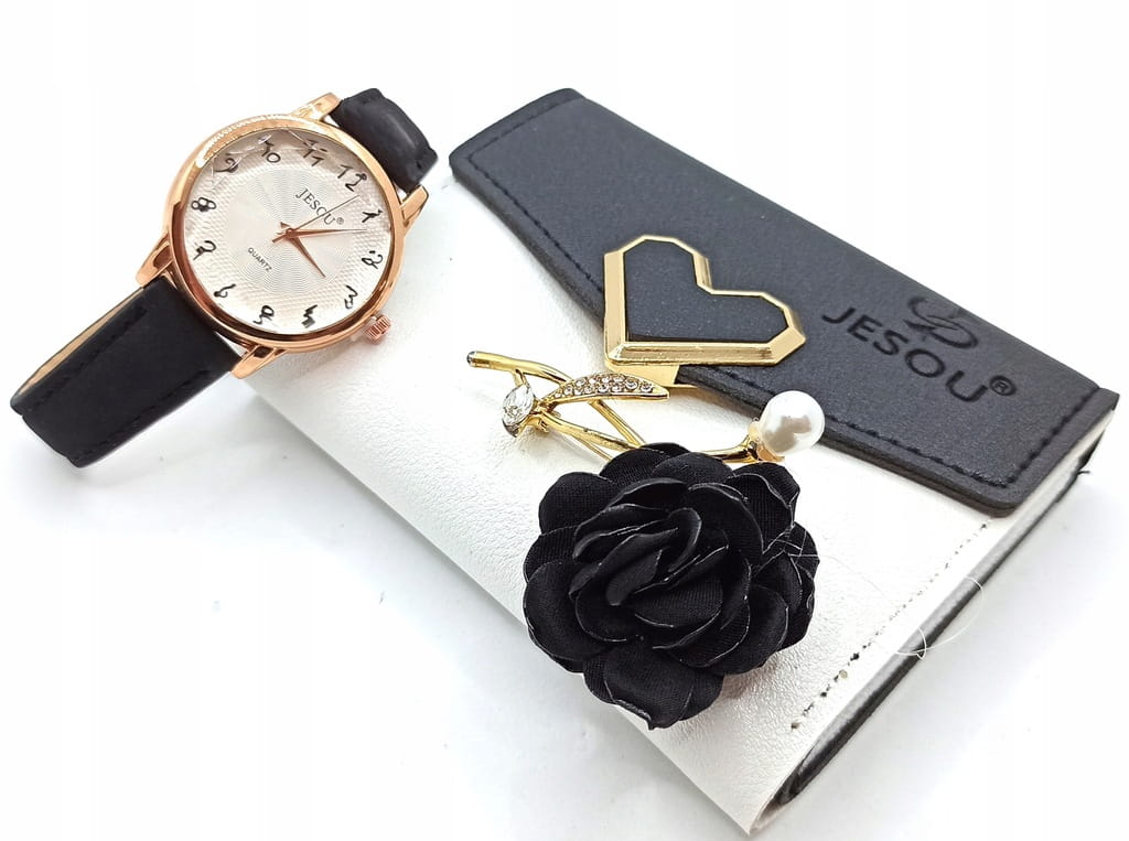 Zawartość zestawu: czarny portfel + broszka + zegarek