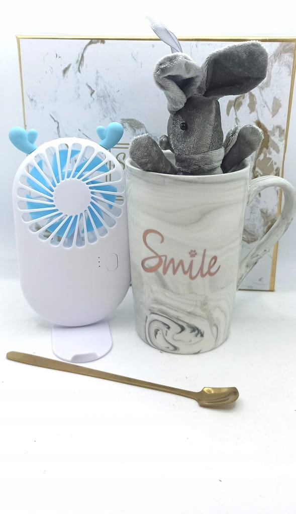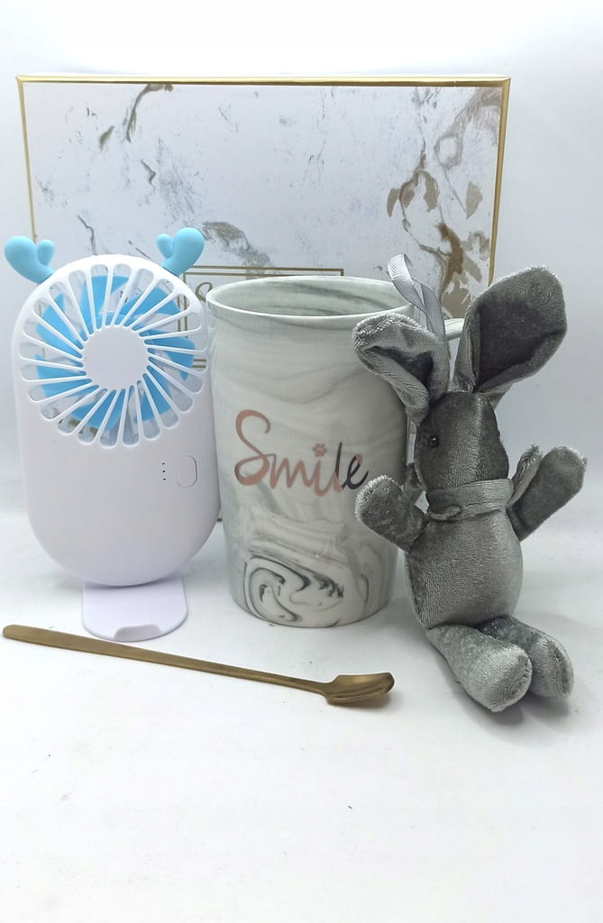 Zestaw Prezentowy dla Kobiety – Kubek Ceramiczny, Mini Wiatraczek i Satynowy Króliczek