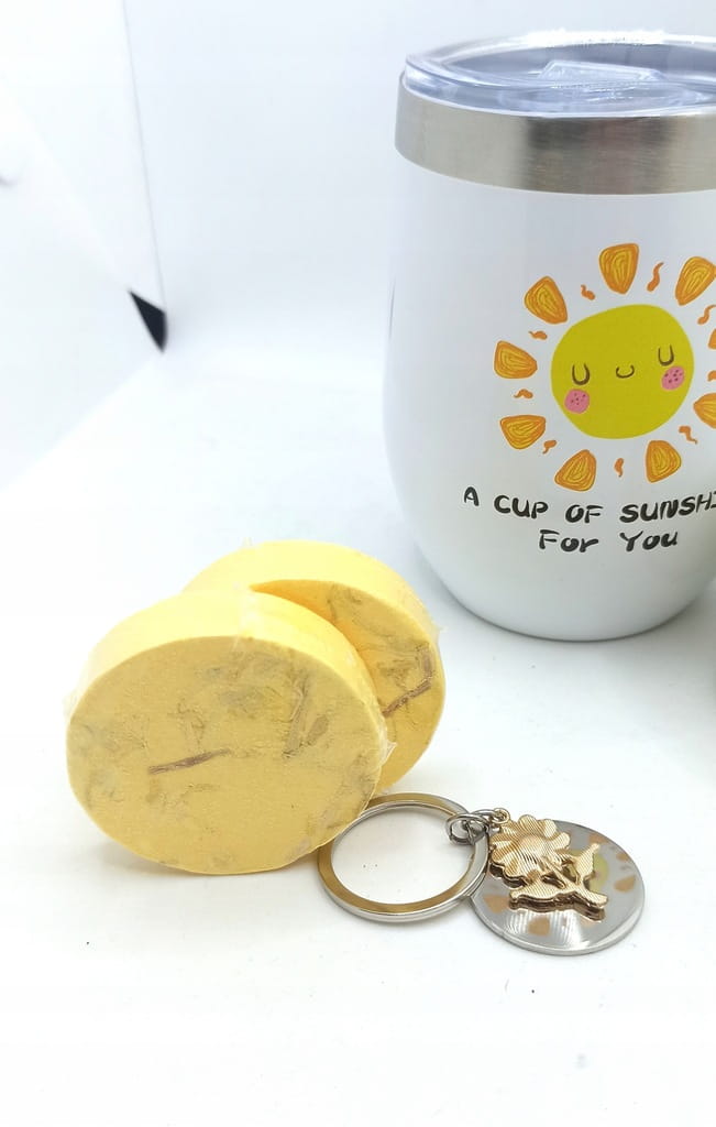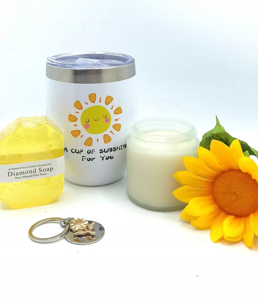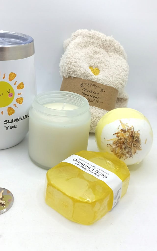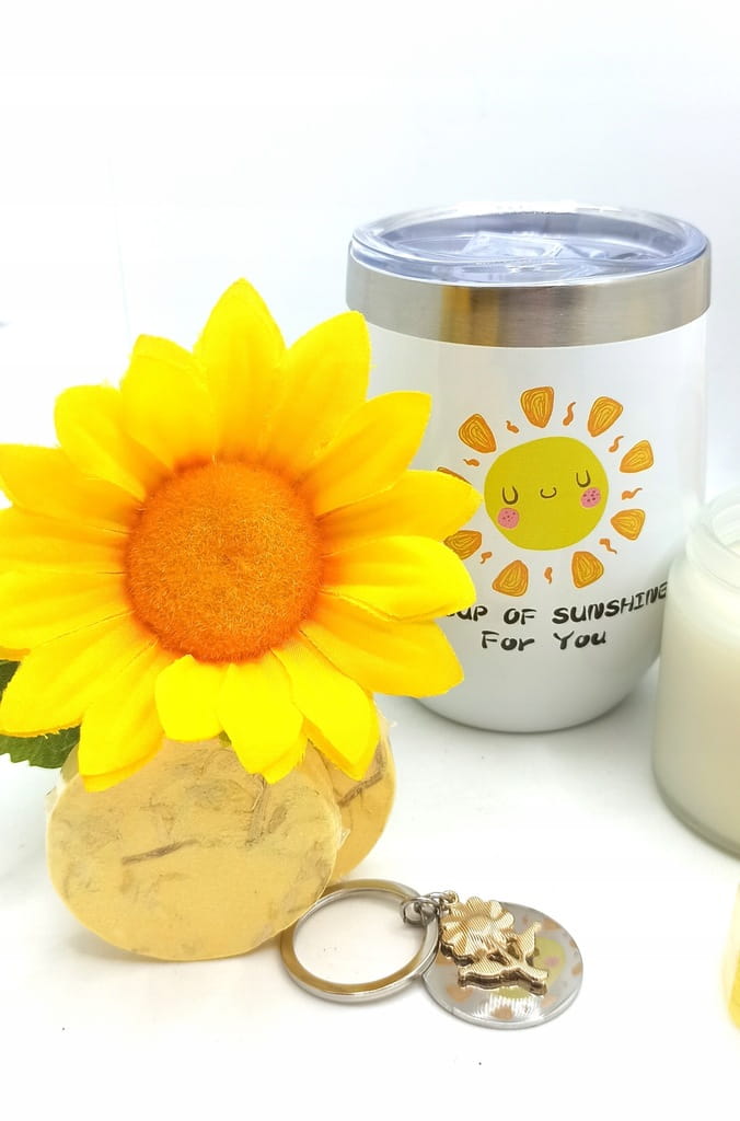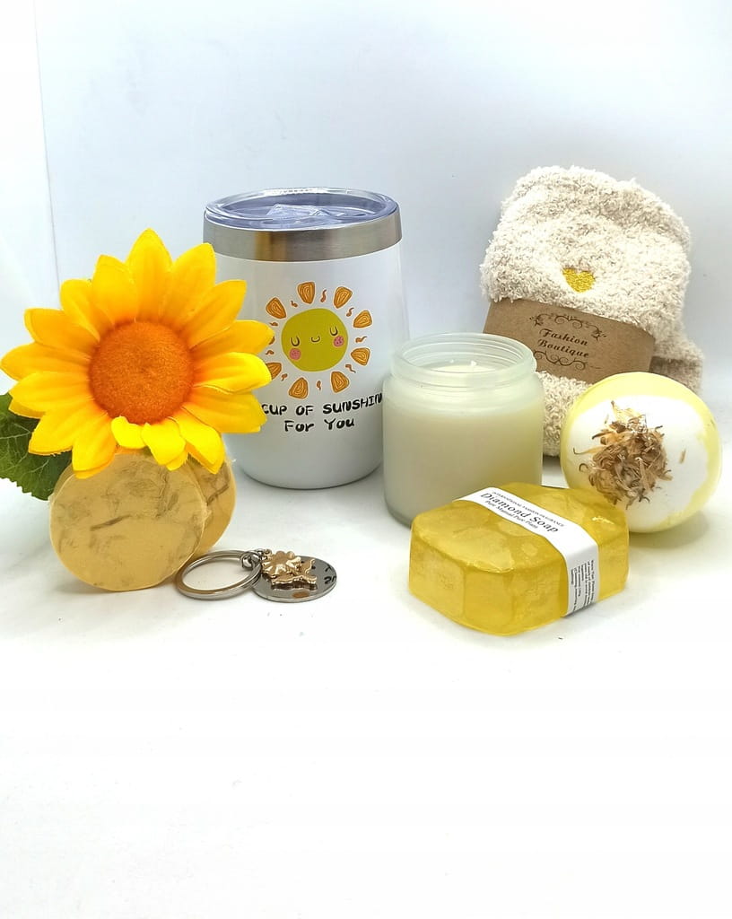 Kula do kąpieli, świece, mydło do twarzy i ciała, kapsułki musujące, ciepłe skarpetki, breloczek i ozdobny słonecznik