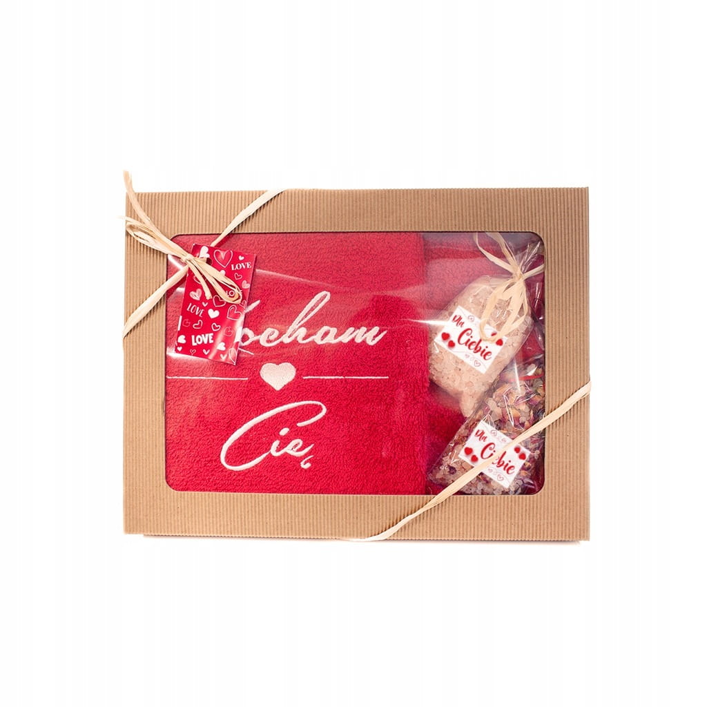 Zestaw prezentowy - ręcznik z napisem "KOCHAM CIĘ" kolor czerwony + sól himalajska + płatki róż w ozdobnym opakowaniu